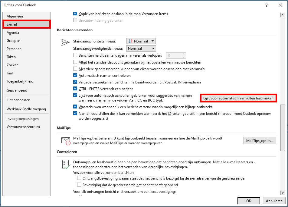 Onder `Berichten verzenden` staat `Lijst voor automatish aanvullen leegmaken` druk hierop.