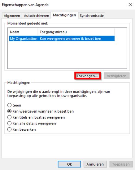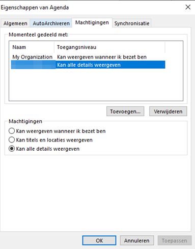 Deel je de agenda met iemand binnen dezelfde Office 365 organisatie, dan komen we nog 2 opties bij: