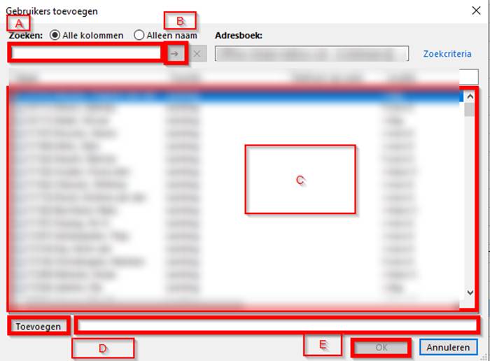 - C: Hier worden de gevonden zoekresultaten weergeven, dubbelklik op een naam om hem of haar toe te voegen aan D;